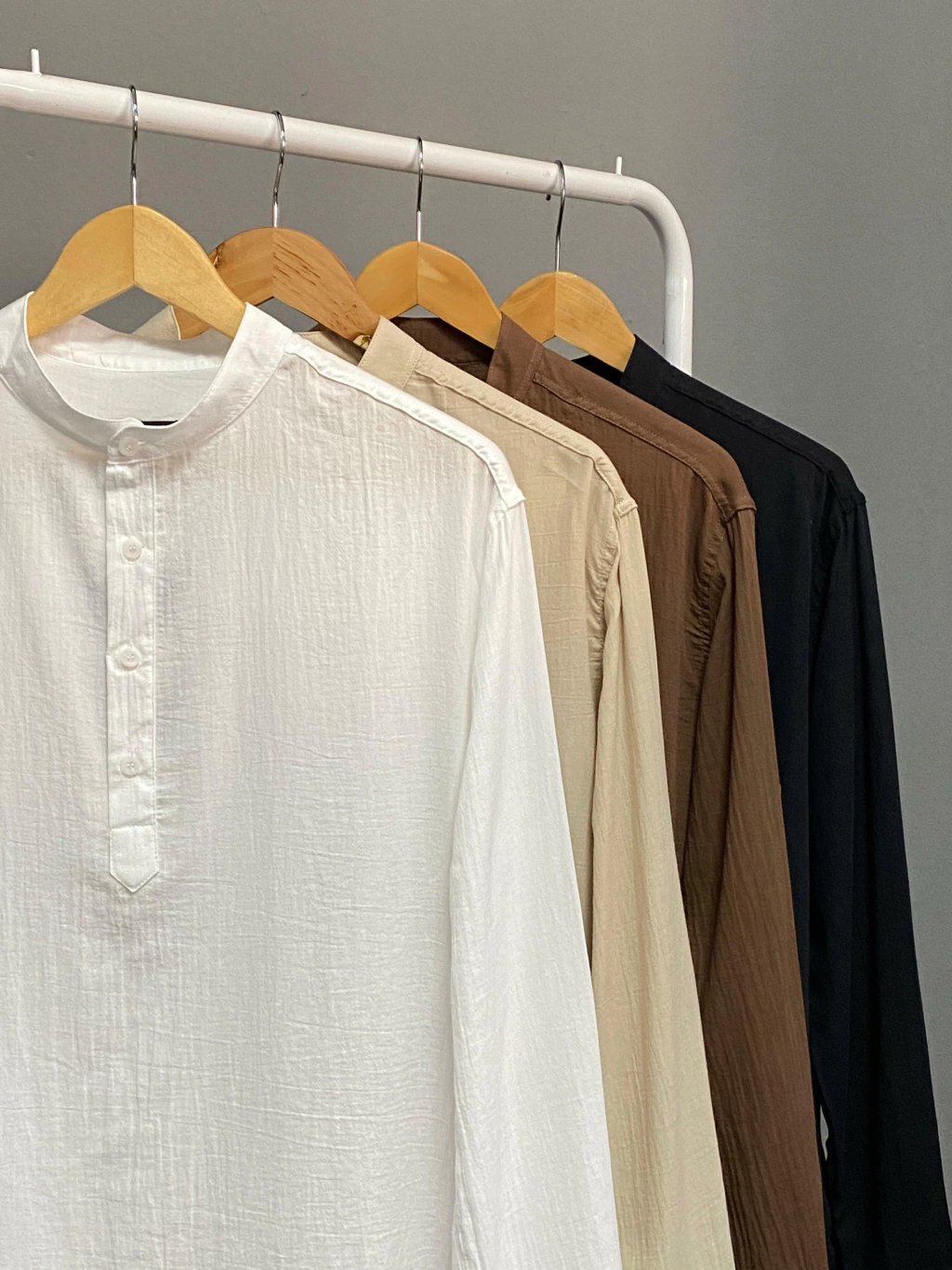 Confeccionada en lino 100% algodón. Corte regular. Ajuste clásico. Las mangas cuentan con cartera, permitiendo ajustar a tu preferencia. Colores: Blanco, Negro, Beige, Chocolate. 5 Talles: S - M - L - XL - XXL